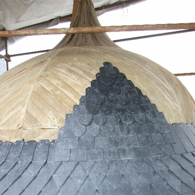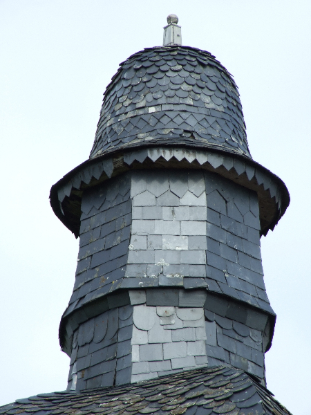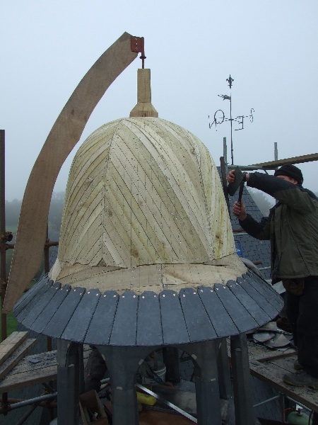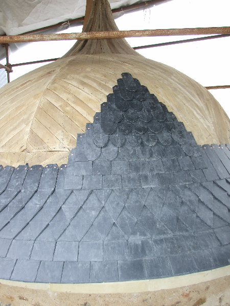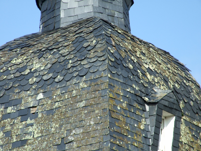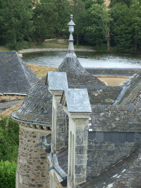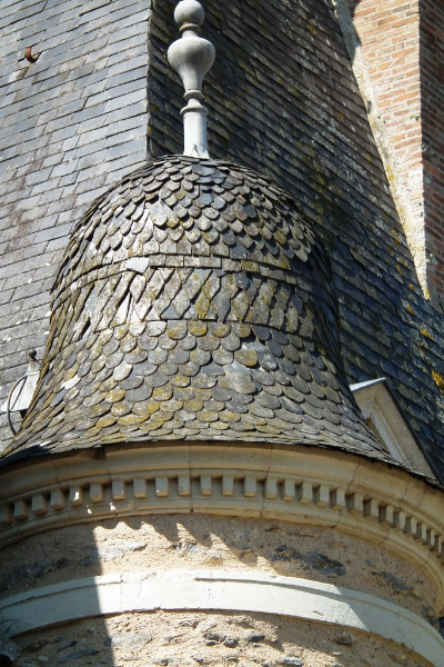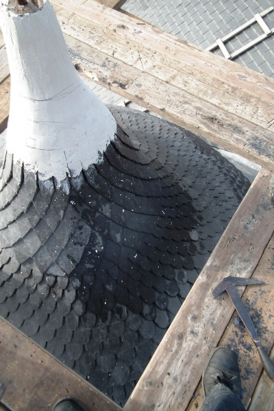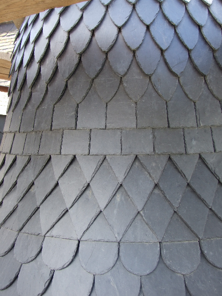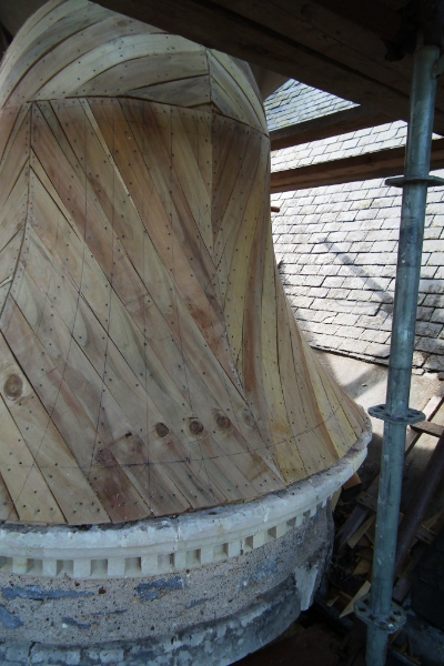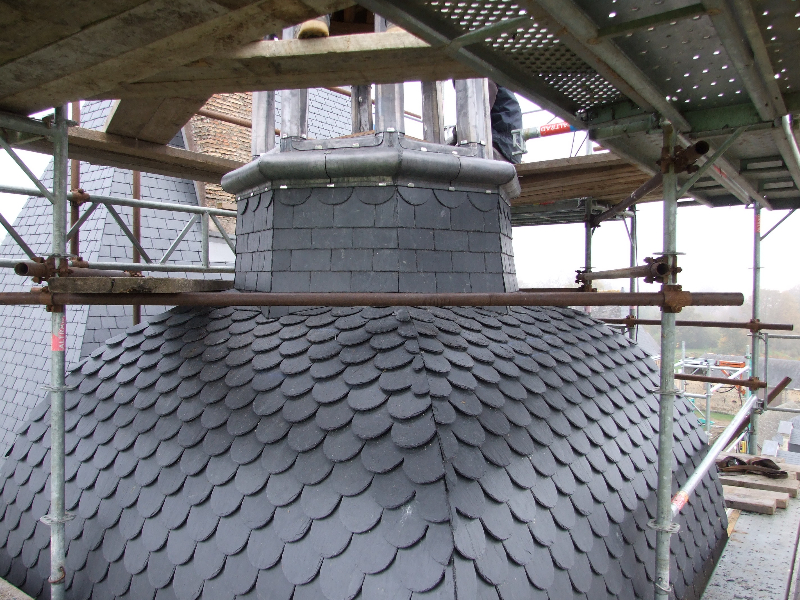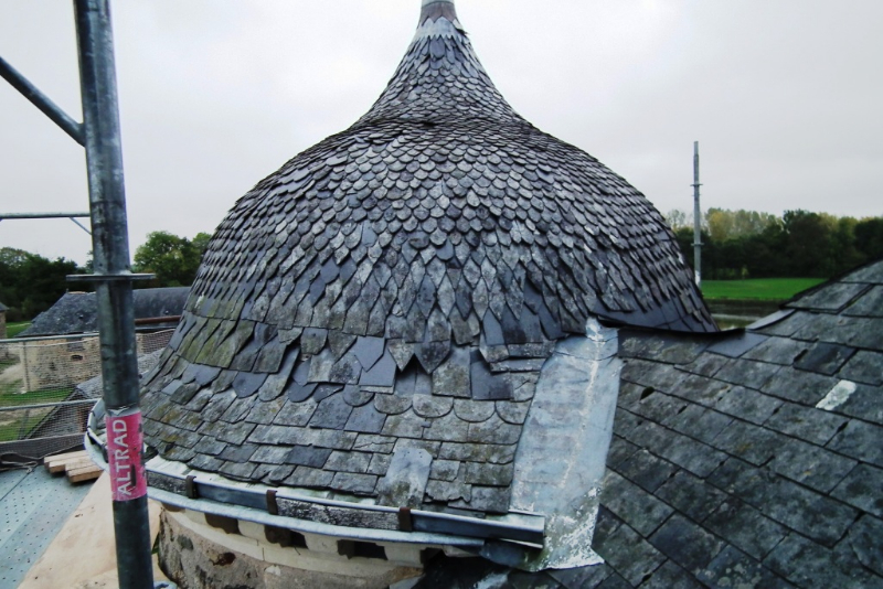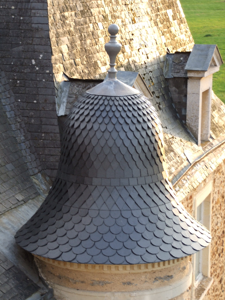 A noter le travail très soigneux réalisé sur la tour Nord-Est et la tourelle ouest: deux couches de voligeage jointif en peuplier; installation d’un simbleau (sorte de compas, dont la pointe est à l’emplacement de l’épi de faîtage, qui permet de tracer des horizontales et des verticales sur les voliges, afin d’avoir une parfaite mise en place des ardoises (au clou). Celles-ci ont leur pureau découpé (partie visible de l’ardoise taillée sur place à la main) pour former des bandes décoratives. La largeur des ardoises devient de plus en plus petite du bas jusqu’en haut.