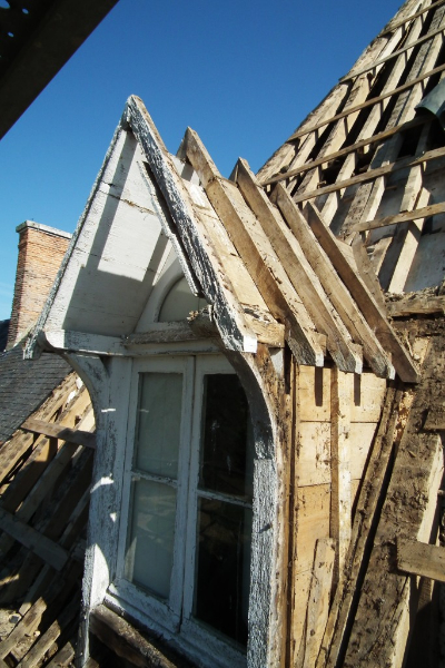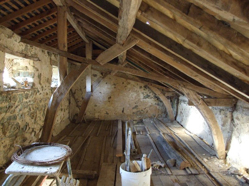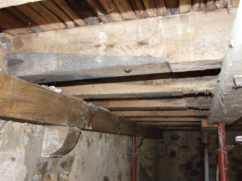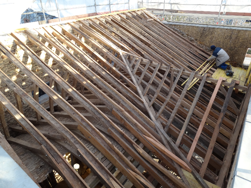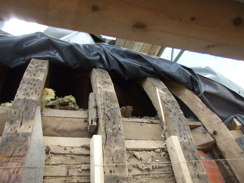 – Pièces de charpente en partie pourries à remplacer, chevrons nécessitant presque tous d’être entrées, remplacement des sablières…