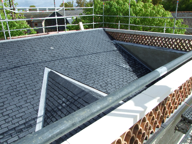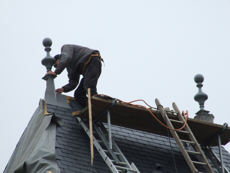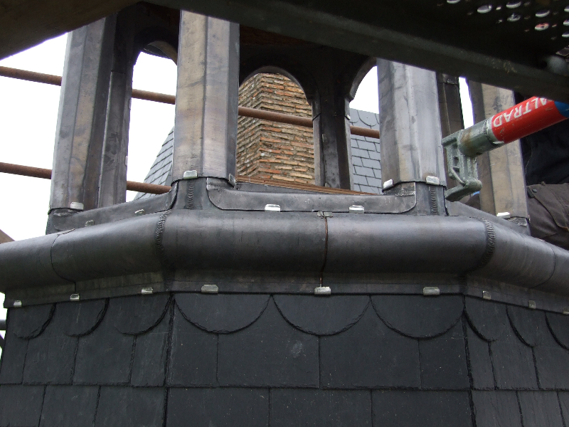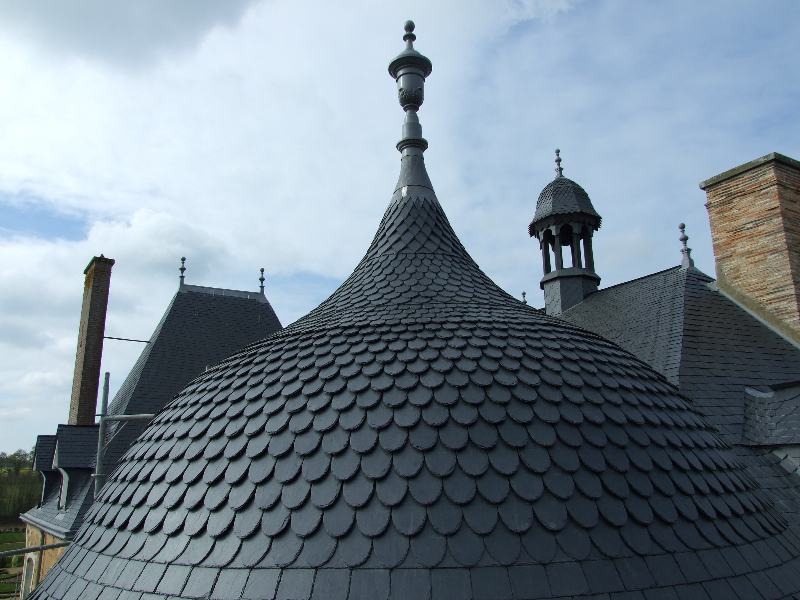 Après un voligeage soigneux, les ardoises d’Angers Trélazé sont mises en place: au crochet sur le pavillon Nord, au clou sur le pavillon sud-ouest. Deux couches jointives en peuplier sont posées sur la coupole de la tourelle, ensuite recouverte de bandes d’ardoises décoratives à pureau découpés, taillées sur place. Les noues réalisées sont rondes, en ardoises. Les lucarnes ont une couverture en plomb avec habillage des jouées de corniche.