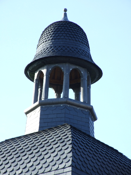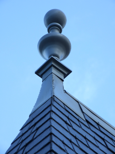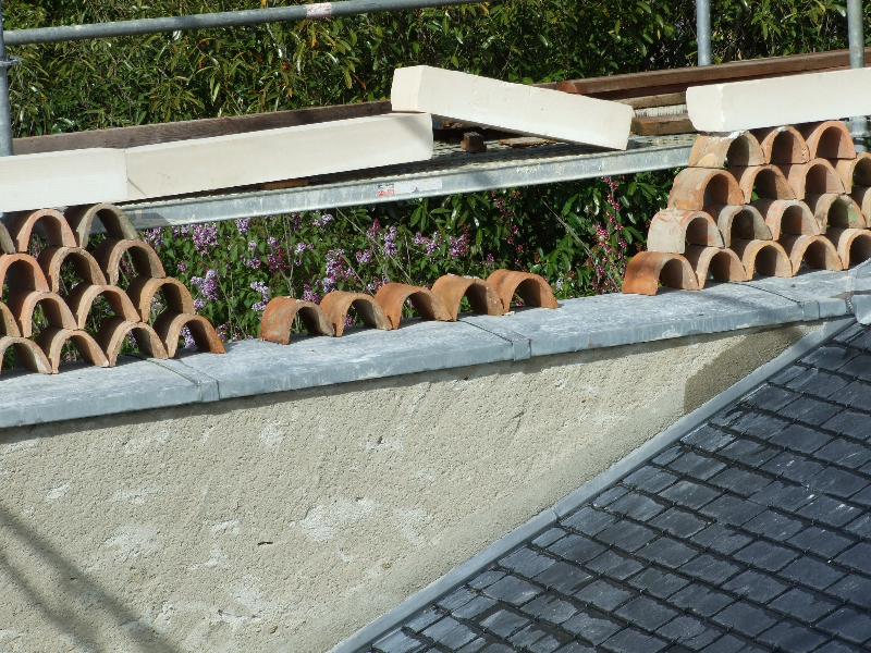 Les noues sont réalisées comme à l’époque: en ardoises, arrondies. Le faîte du toit est un faîtage lignolet, et par endroit en zinc. Les épis de faîtages sont réparés ou remplacés en copiant le modèle ancien.