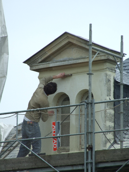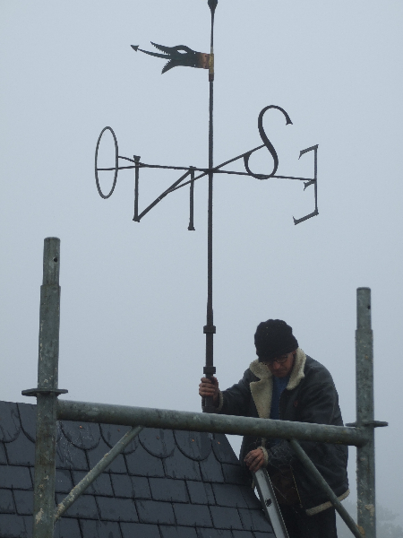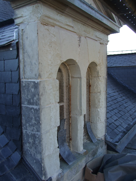 Les lucarnes en tuffeau sont restaurées avec changement de certaines pierres, puis patinées. La girouette qui a été descendue, est réparée, puis remise