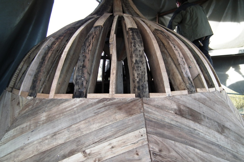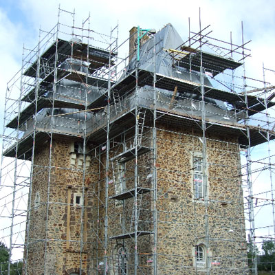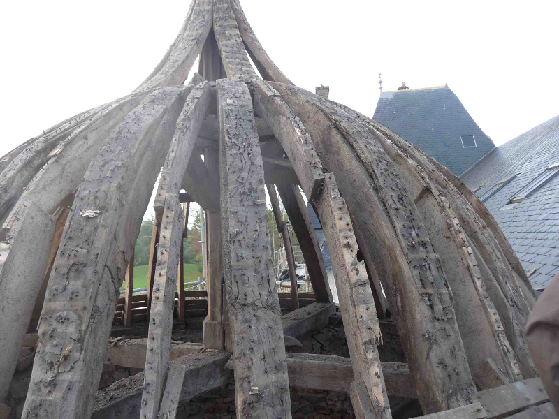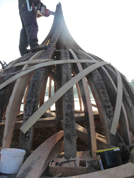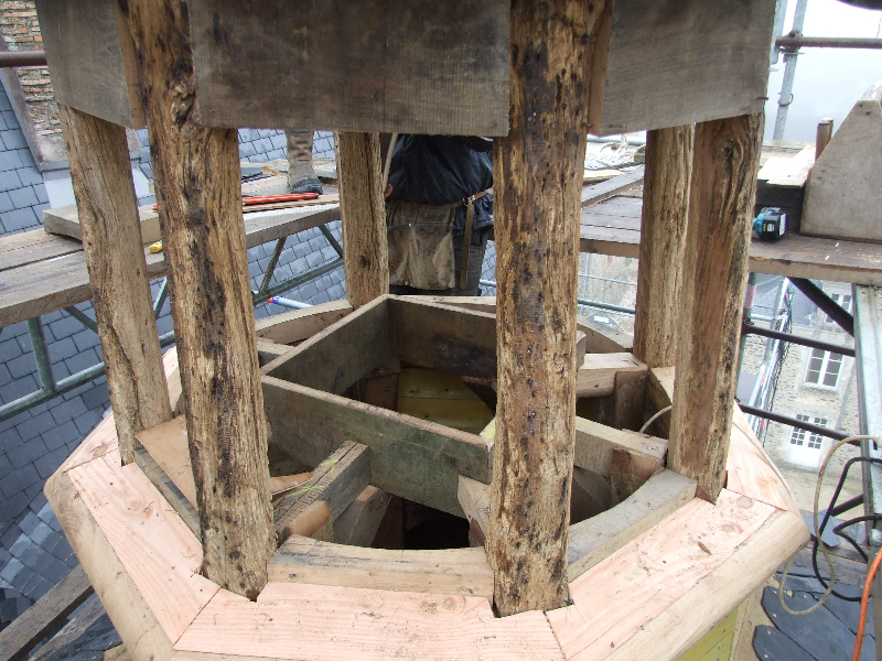La charpente est ensuite restaurée avec changement ou entures des coyaux, reprise des poutres et des chevrons. En observant soigneusement les montants de la tourelle sommitale, le charpentier se rend compte qu’ils sont chanfreinés: la tourelle devait être « ouverte » lors de la construction du château. Il est alors décidé, après accord de la DRAC et de l’Architecte des Bâtiments de France, de la refaire telle qu’elle devait l’être à l’origine, avec un habillage au plomb des montants