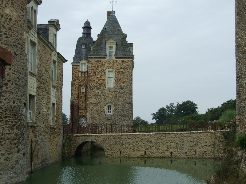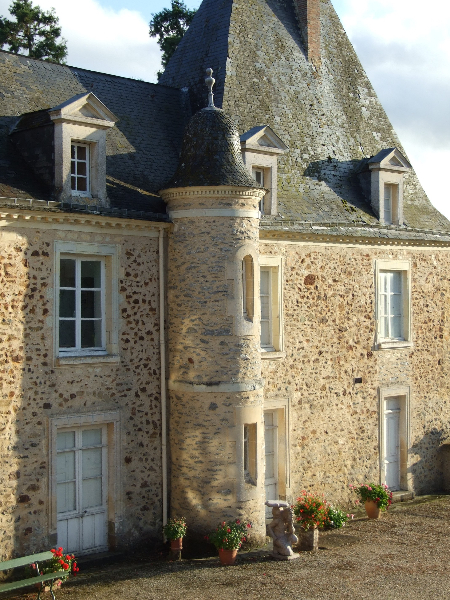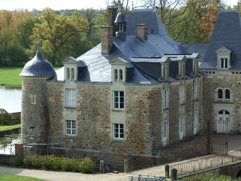 2012 : La toiture du donjon, typiquement mayennaise avec son pavillon sud-ouest avec toit à l’impériale surmontée d’une tourelle sommitale, montre de nombreux trous, ardoises déplacées et manquantes. Certaines pièces de charpente cassées ou très altérées, doivent être changées ou renforcées. La girouette ne tient plus que par miracle. Neuf lucarnes en tuffeau ornent le bas de cette toiture: certaines pierres sont cassées et doivent être changées, d’autres peuvent se contenter d’une restauration plus simple. Les menuiseries des fenêtres doivent être remises en état et repeintes.Le pied de la cheminée montre un trou important qui compromet sa stabilité.