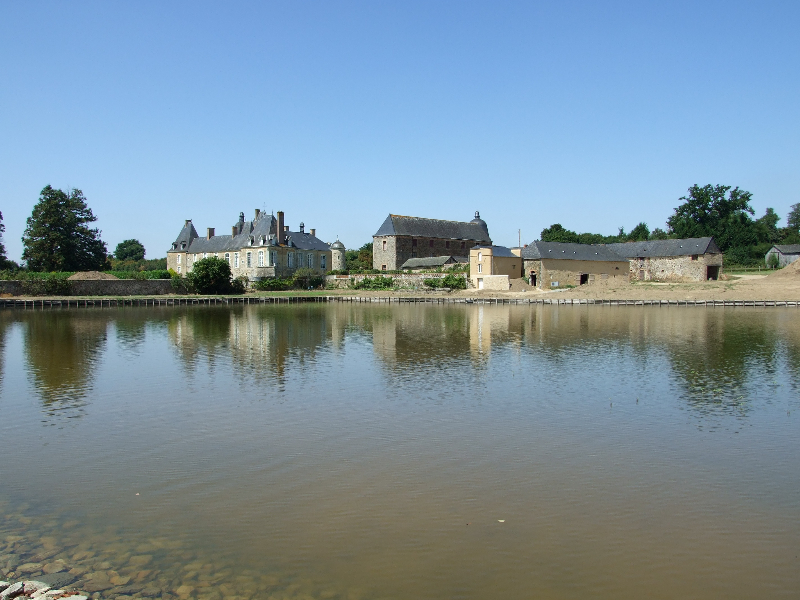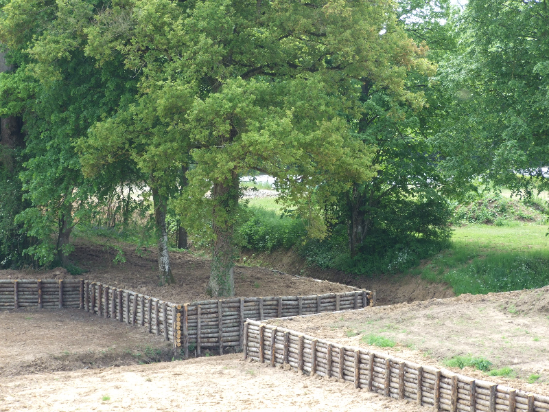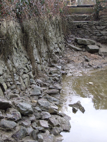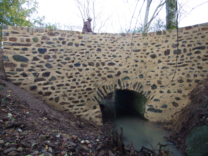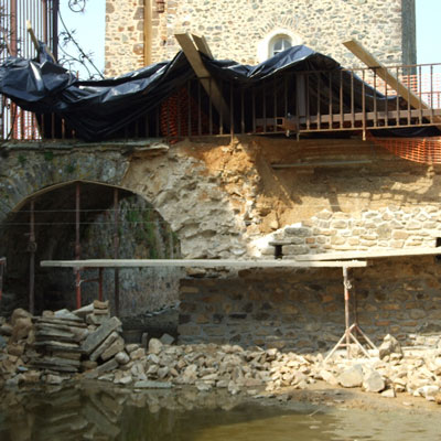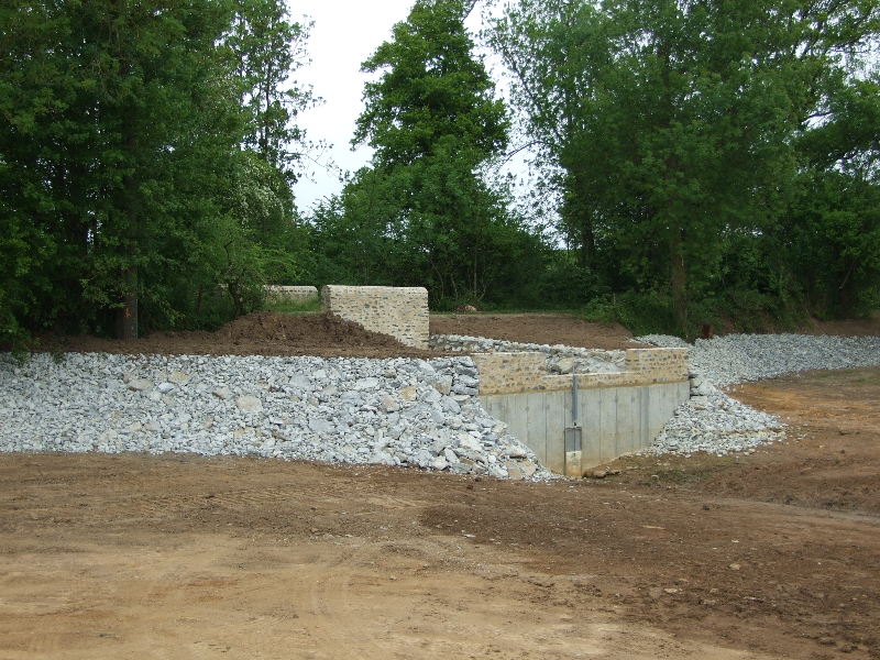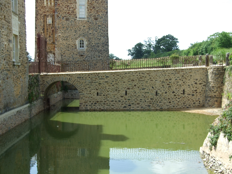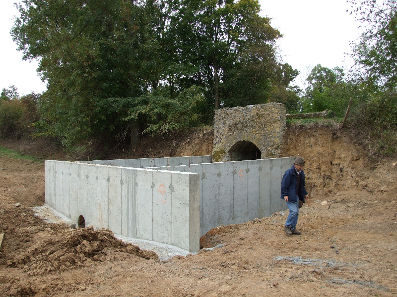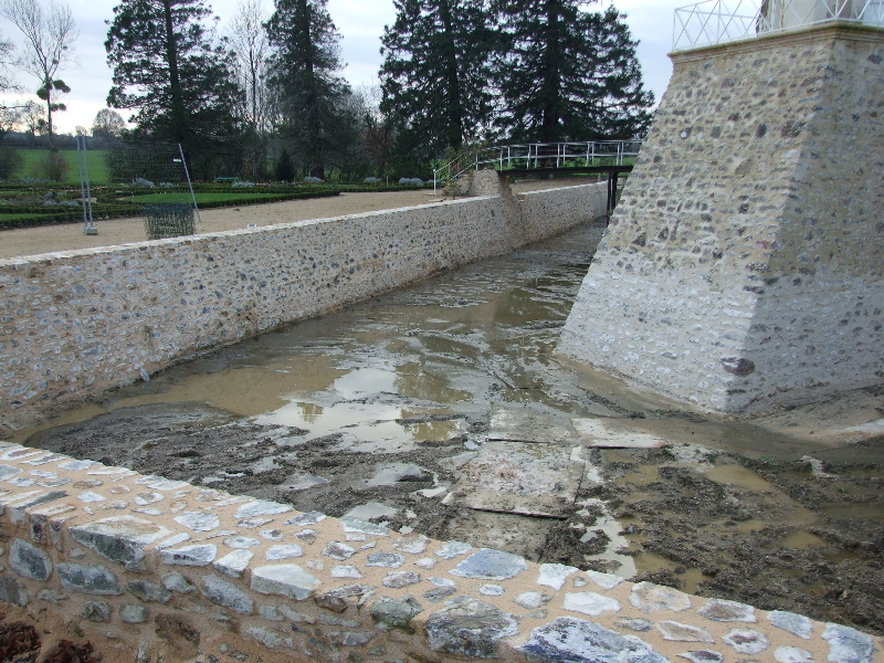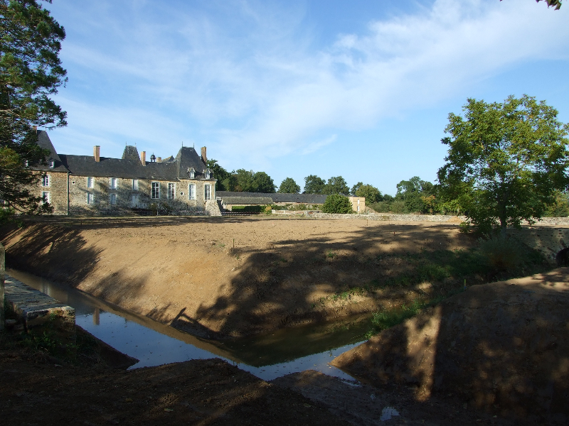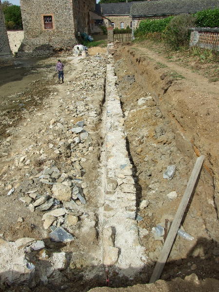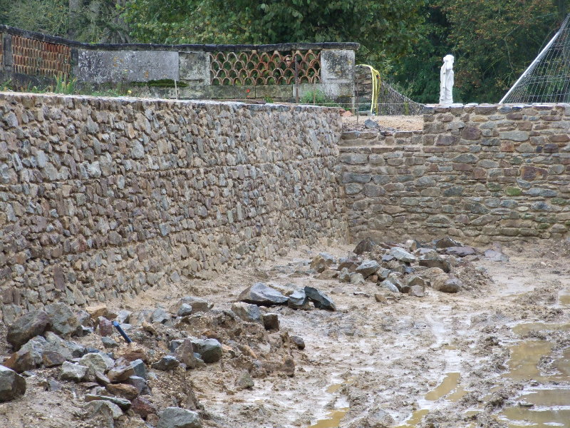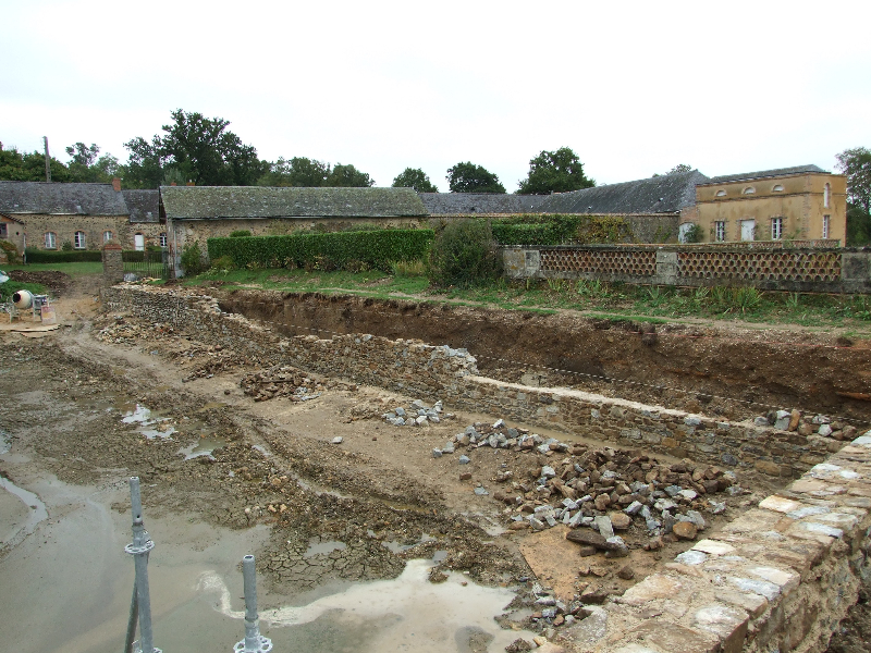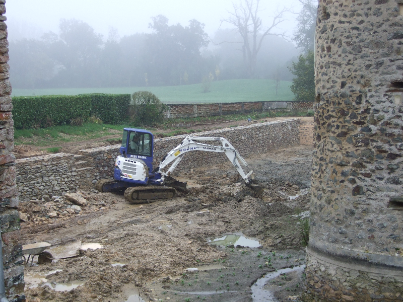 Les douves sont donc vidées, et les nombreuses carpes qui y vivaient transportées dans un plan d’eau voisin. Un piquetage du vieil enduit est réalisé. Les pieds de murs sont repris, les plantes et lierre soigneusement enlevés avec leurs racines. Le mur Est doit être entièrement démonté, puis refait au mieux. Les têtes de murs sont remises en état. Après essai, un enduit est passé, avec tentative de patine pour s’accorder avec les quelques parties anciennes restantes. Des fuites persistantes à l’angle Sud-Est nous obligent encore à refaire une tranchée, avec reprise du mur et mise en place imminente d’argile.