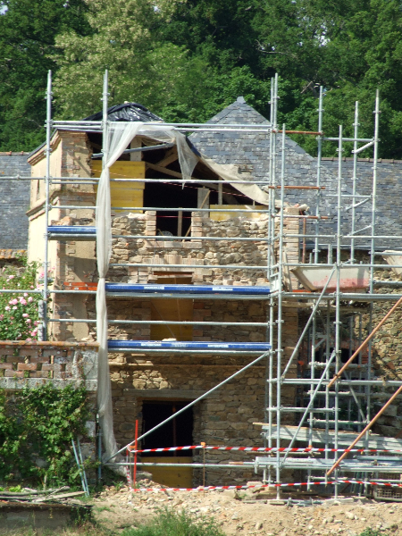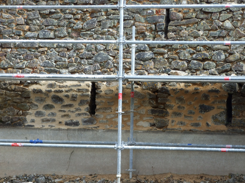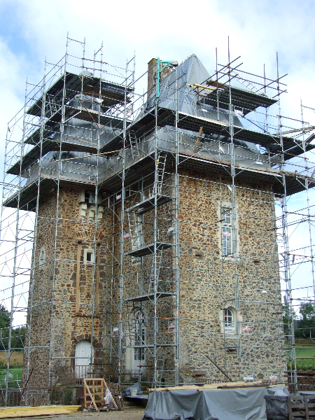 Les douves sont d’abord vidées afin de pouvoir installer un échafaudage impressionnant qui entoure tout le donjon depuis son pied jusqu’à mi-hauteur de la toiture, puis jusqu’en haut de la tourelle.