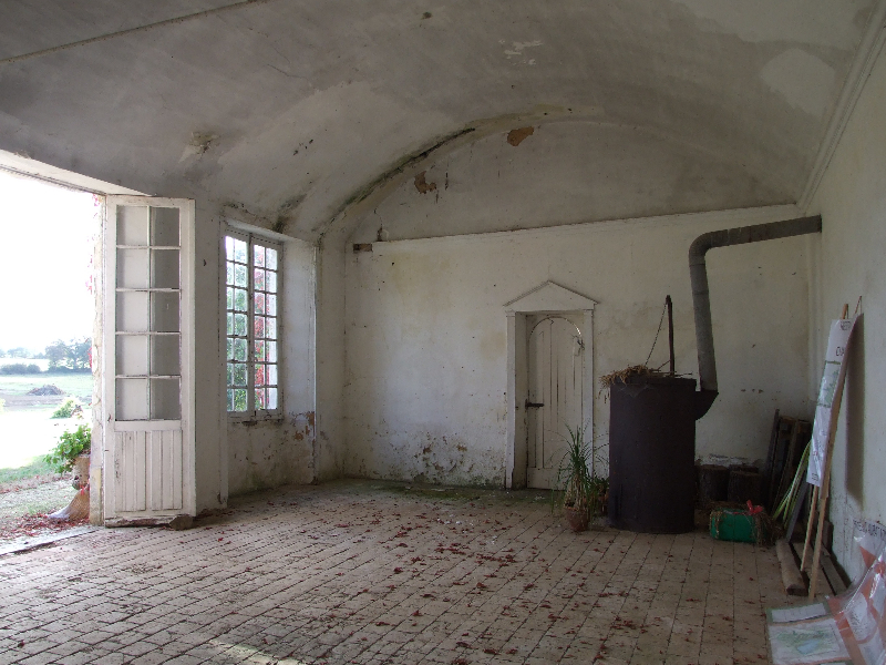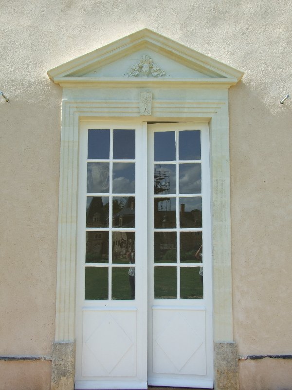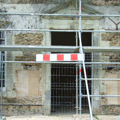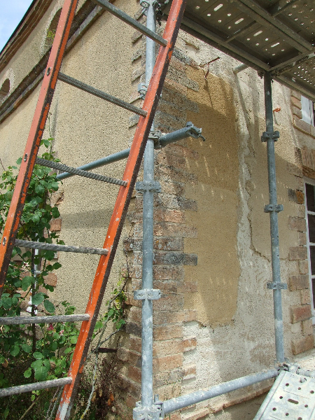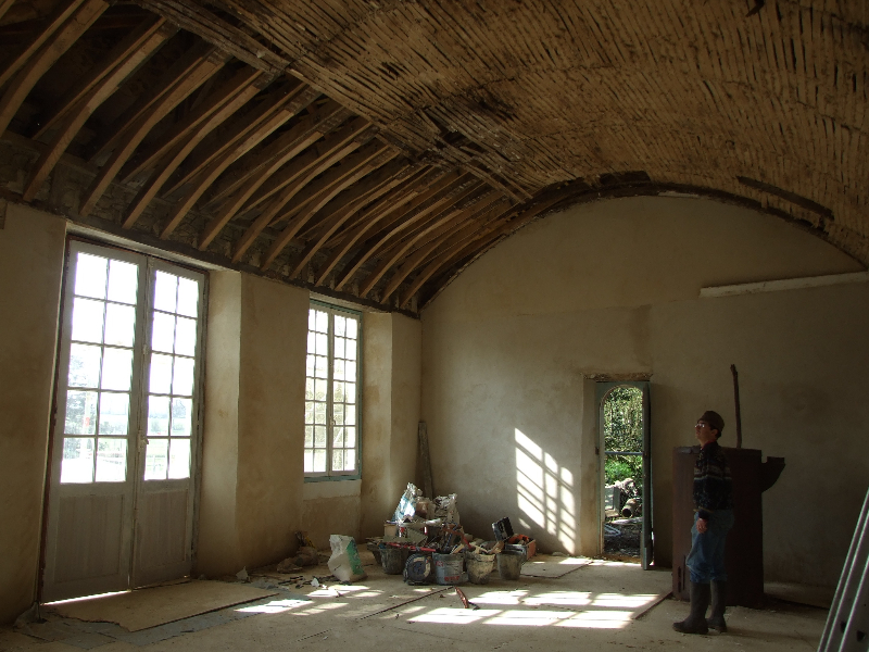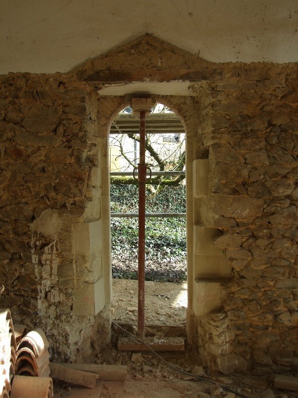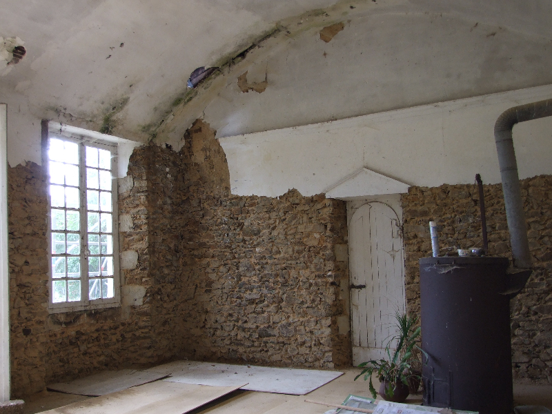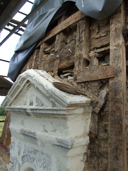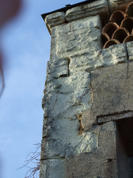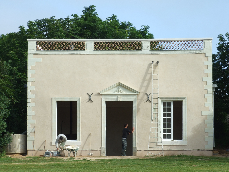 Maçonnerie : la façade présente un dévers important, l’enduit totalement parti par endroit sera refait complètement (17 essais pour retrouver le grain rosé grâce à des éclats de brique), la vigne-vierge se faufile entre le tuffeau et le chambranle des fenêtres, les pierres en tuffeau cassées ou usées doivent en partie être remplacées, la voûte est percée par endroits. La sculpture du fronton, retrouvée en morceaux par terre lors de notre arrivée sera sculptée sur place. Les tuileaux formant le claustra sont pour certains cassés: un moule sera fabriqué pour pouvoir en refaire de nouveaux. L’enduit intérieur et la voûte sont refaits.