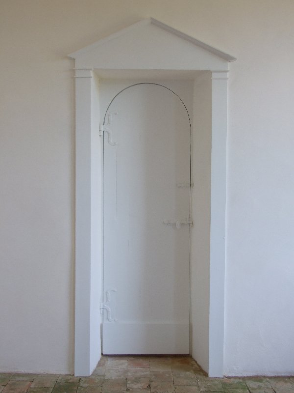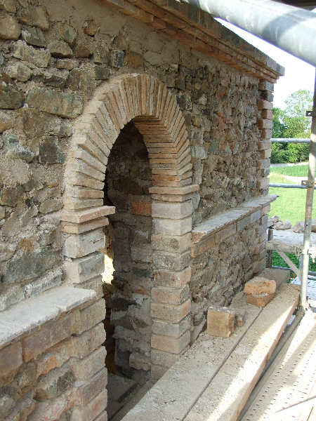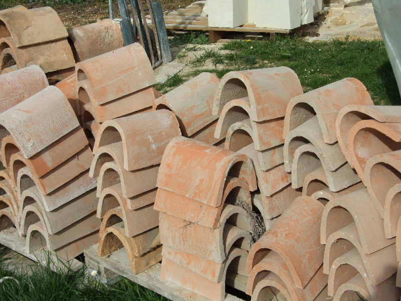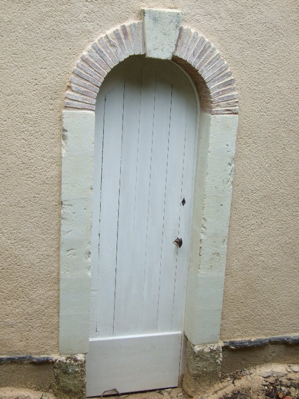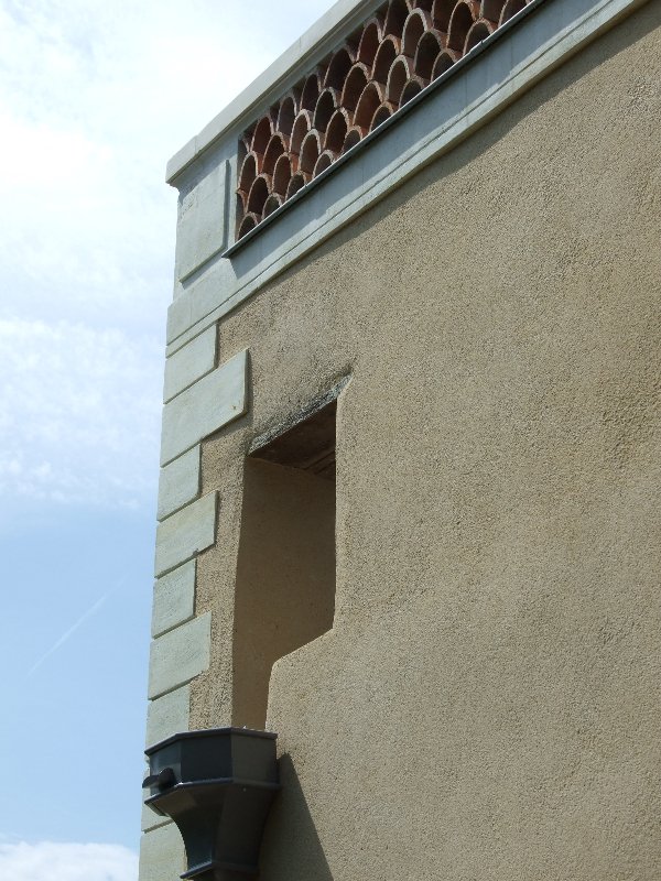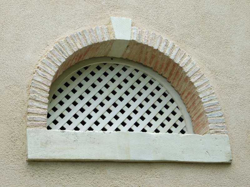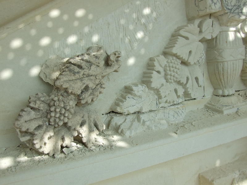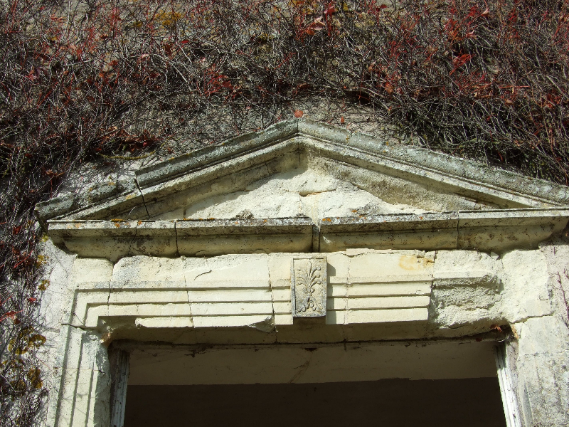 Maçonnerie : la façade présente un dévers important, l’enduit totalement parti par endroit sera refait complètement (17 essais pour retrouver le grain rosé grâce à des éclats de brique), la vigne-vierge se faufile entre le tuffeau et le chambranle des fenêtres, les pierres en tuffeau cassées ou usées doivent en partie être remplacées, la voûte est percée par endroits. La sculpture du fronton, retrouvée en morceaux par terre lors de notre arrivée sera sculptée sur place. Les tuileaux formant le claustra sont pour certains cassés: un moule sera fabriqué pour pouvoir en refaire de nouveaux. L’enduit intérieur et la voûte sont refaits.