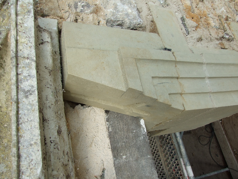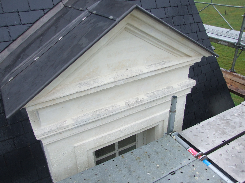 Les pierres de tuffeau des lucarnes et corniches abimées sont remplacées ou restaurées, puis patinées.