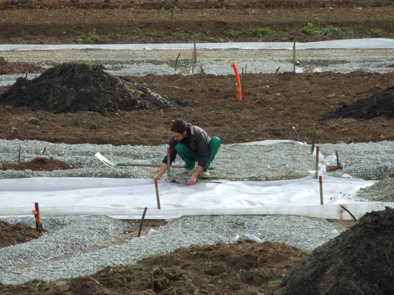 • Réalisation des massifs: apport de sable et de terreau pour alléger la terre locale très argileuse, mise en place du voligeage, apport de mulch