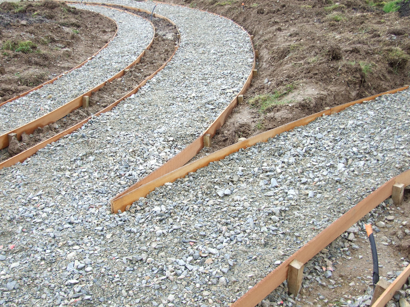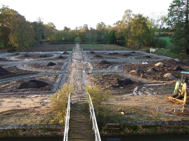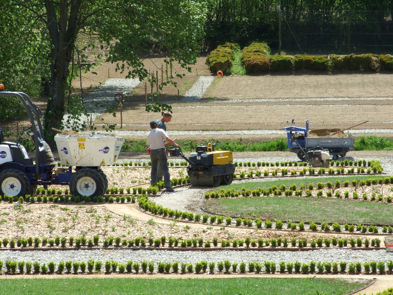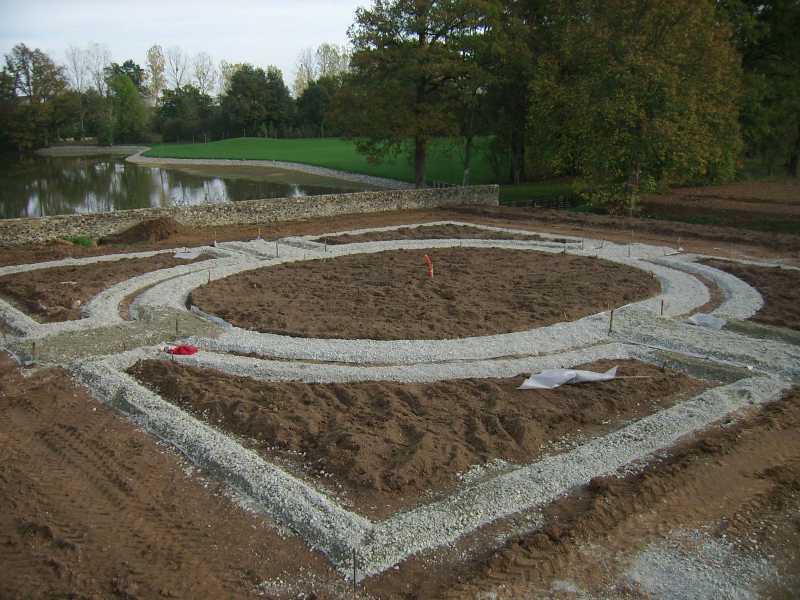 • Tracé des allées, puis mise en place de celles-ci: géotextile, couche de gravier de 15 cm d’épaisseur , compactage, couche d’arène granitique de 5cm, humidification et compactage